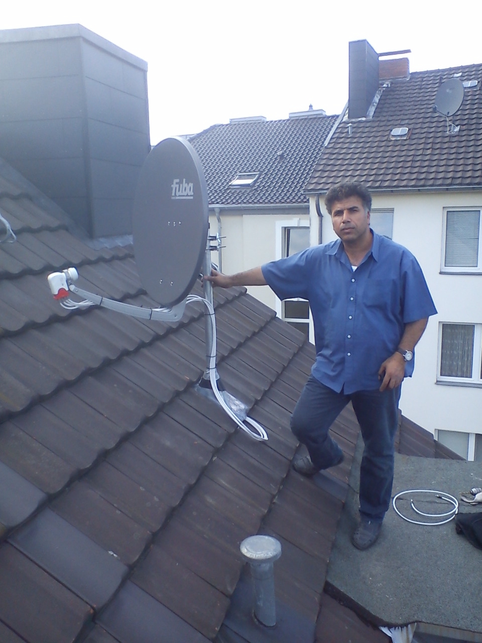Satellitenmontage auf dem Schrägdach falls die Mastanlage dazu gebaut wird